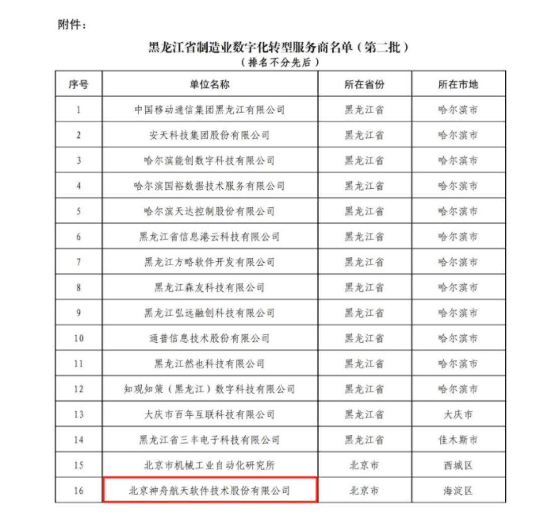 6月11日,黑龍江省工信廳公布了《黑龍江省制造業數字化轉型服務商名單(第二批)》,神軟公司名列其中。