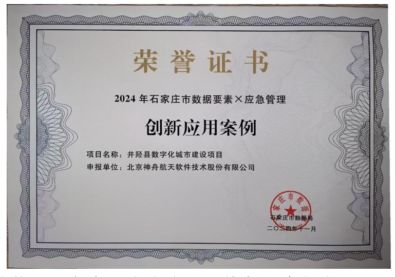 近日,神軟公司承建的井陘縣數字化城市建設項目,榮獲2024年石家莊市數據要素X應急管理創新應用案例獎項。此獎項是依據《“數據要素X”三年行動計劃(2024-2026年)》的要求,由國家數據局、中央網信辦、工業和信息化部等有關部門聯合通過2024年“數據要素X”大賽選拔。